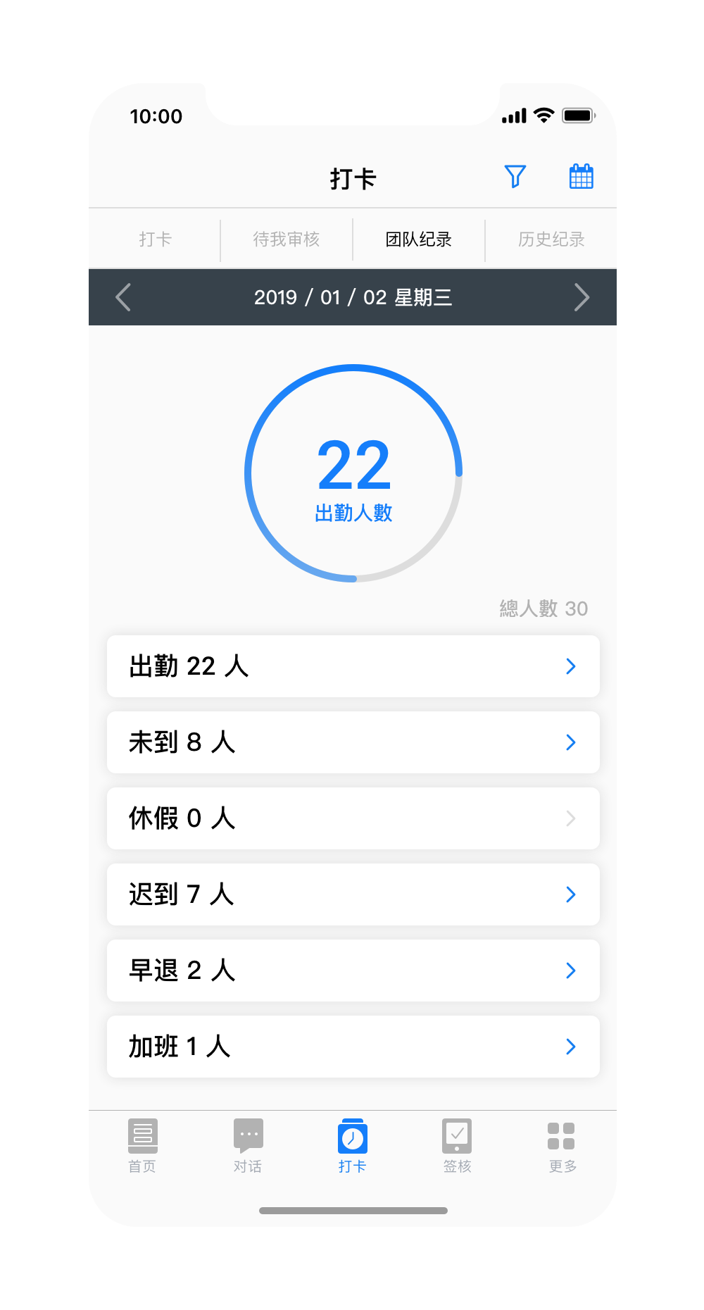 手机即时掌控部门成员出勤状况,并提供多样性报表以计算出勤。