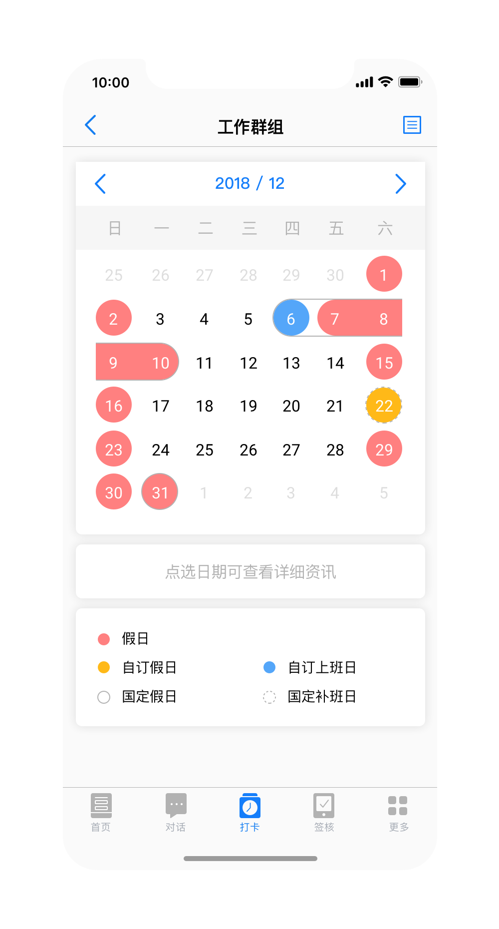 企业可依班别自订办公行事历,并支援弹性上下班、休息时间及跨日班次。