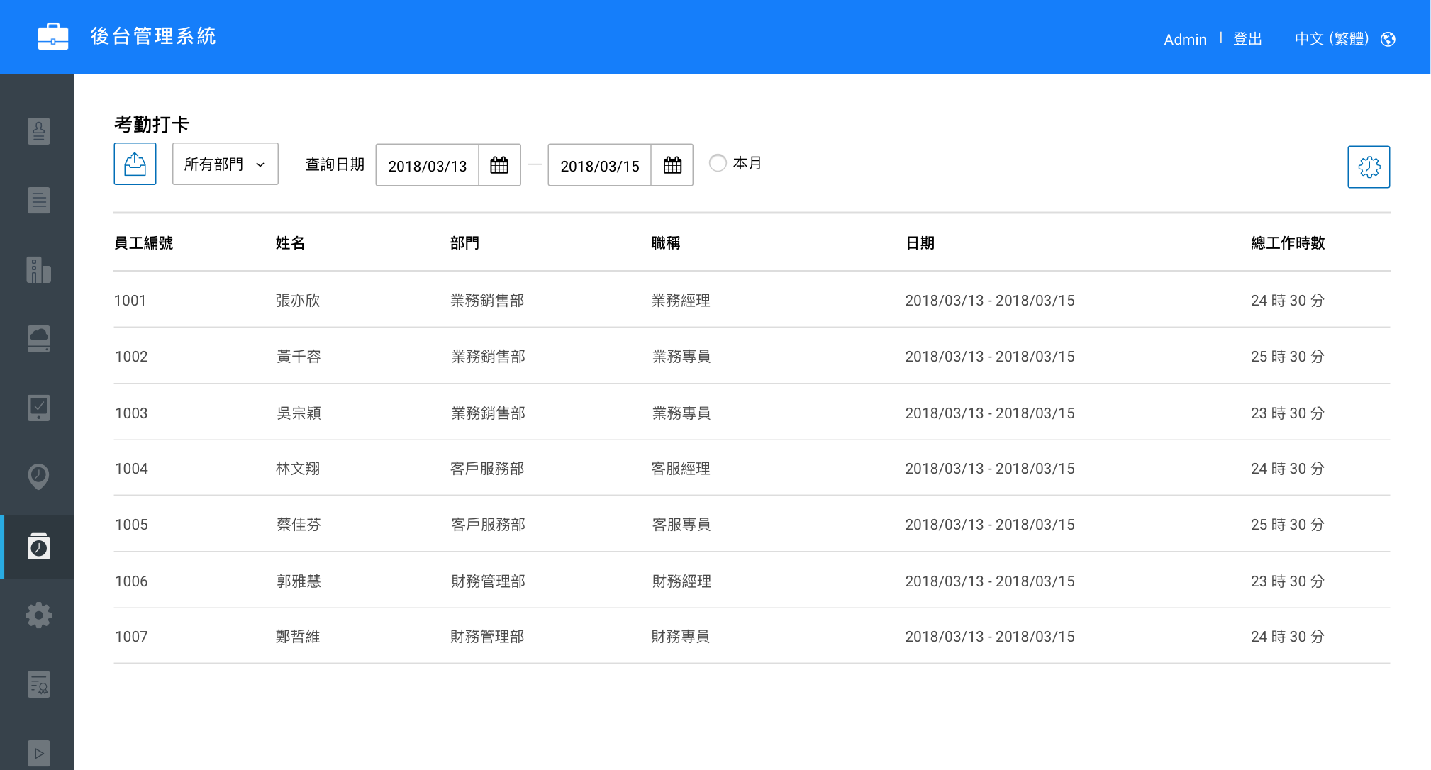 完整記錄員工打卡出勤狀況,管理者可隨時查詢或匯出報表,包含時間、地點並自動計算工作時數。