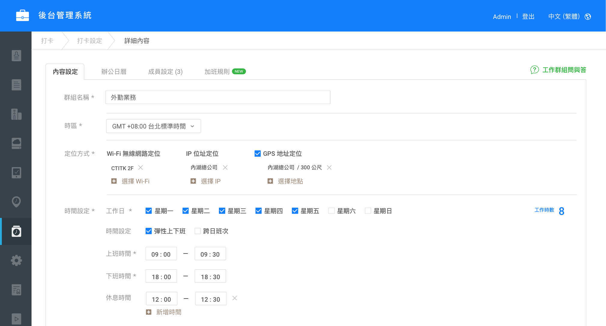 彈性設定考勤規則,相同人員設置同群組,便利資料統計與管理。
