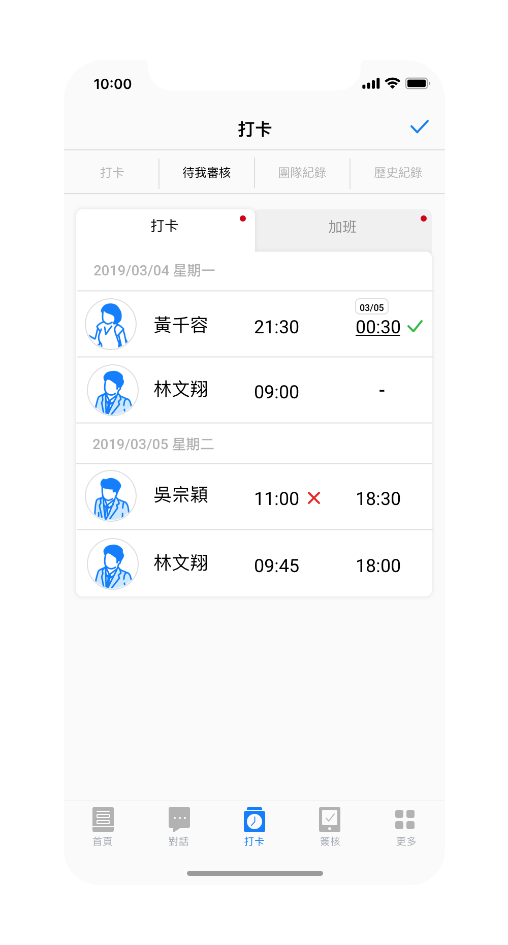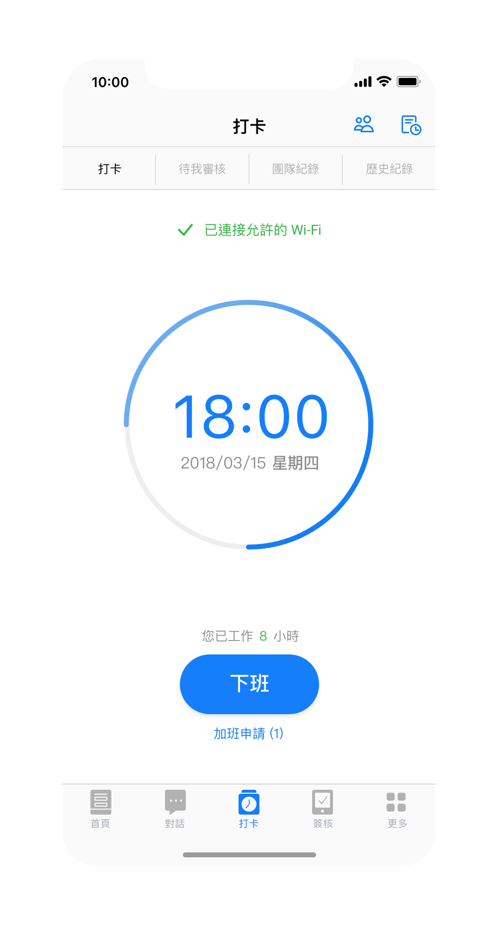 取代傳統打卡鐘,提供手機GPS定位、Wi-Fi連線打卡與網路IP打卡等行動打卡解決方案。自動計算出勤時數並可支援多種格式匯出。