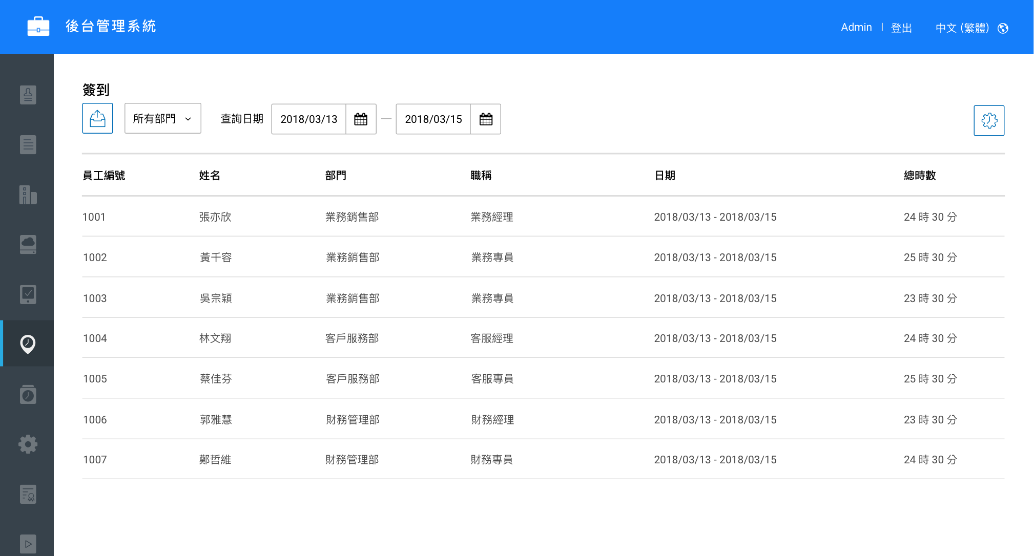 管理者可查詢特定部門、時間區間的員工外勤紀錄,並匯出報表提供人事做為計算出勤的依據。