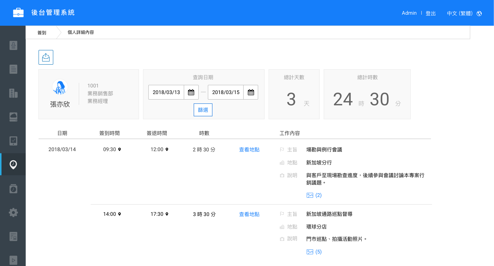 可有效追踪員工外勤簽到紀錄,包含時間、地點及工作回報,並可匯出報表提供人事差勤查核。