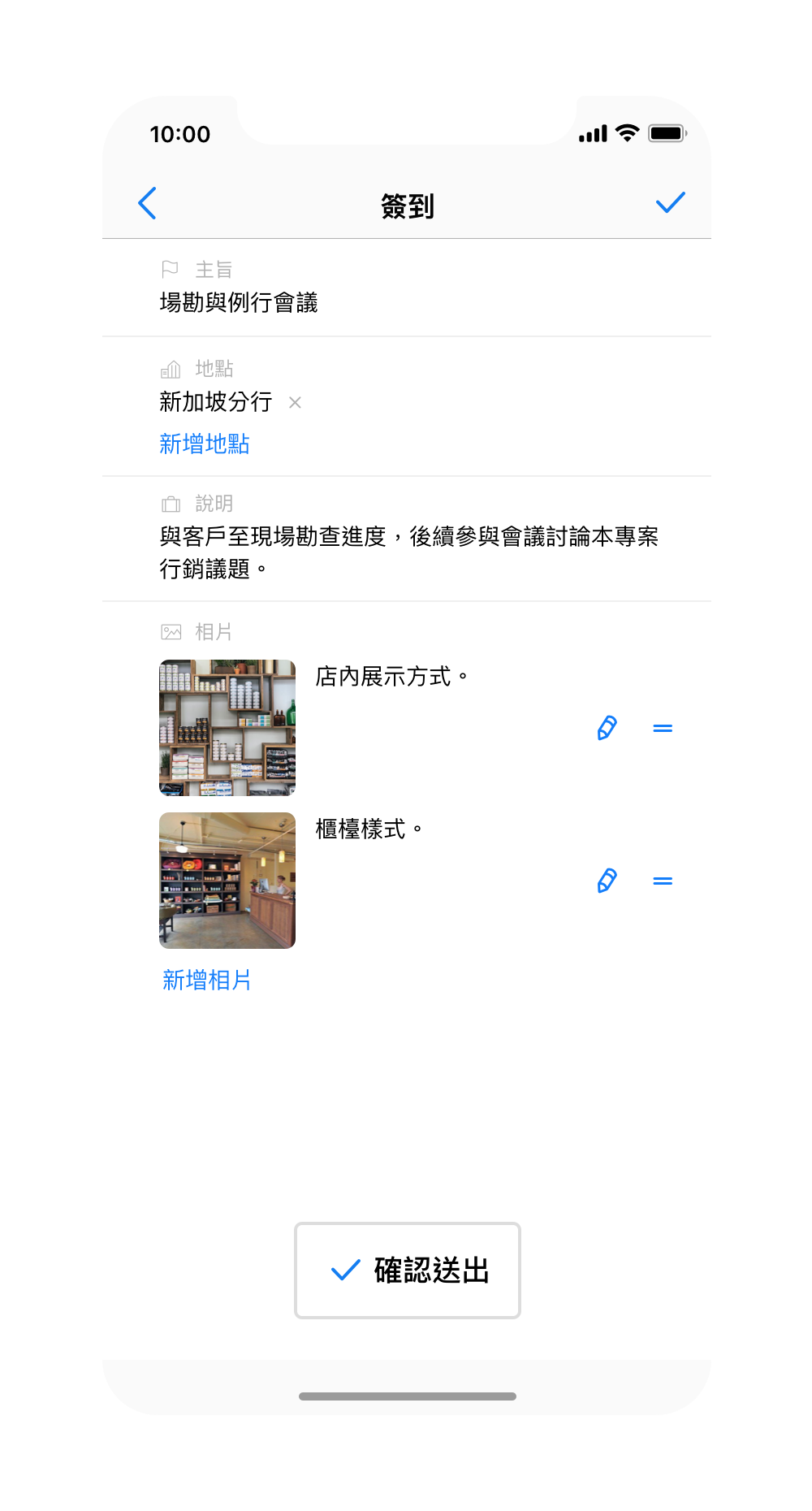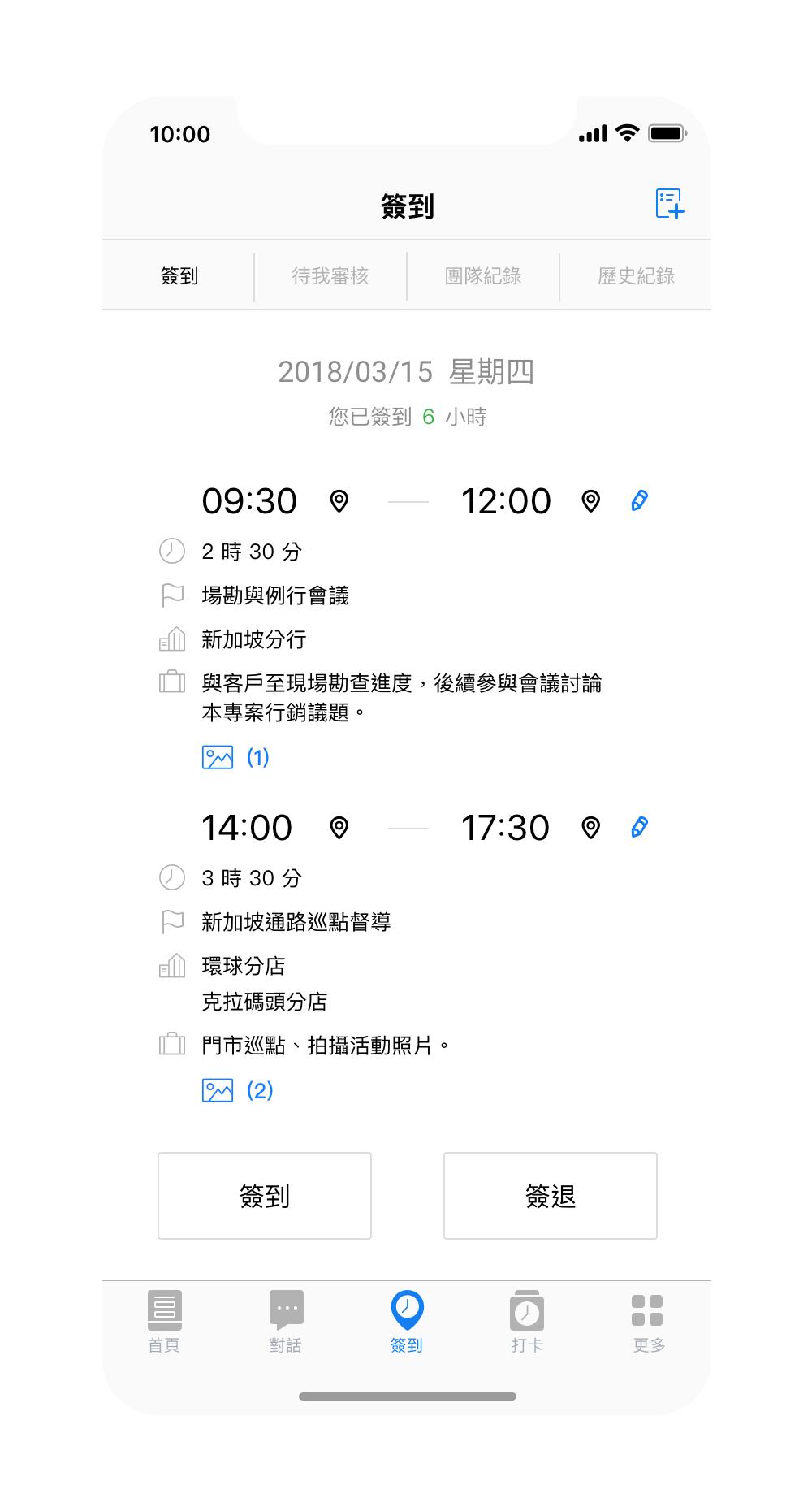 多點多時行動簽到,可記錄多筆簽到之時間、地點、內容等工作資訊,方便管理及留存員工出勤行程紀錄。主管亦可檢視及審核部門所屬同仁之外訪及簽到歷程。
