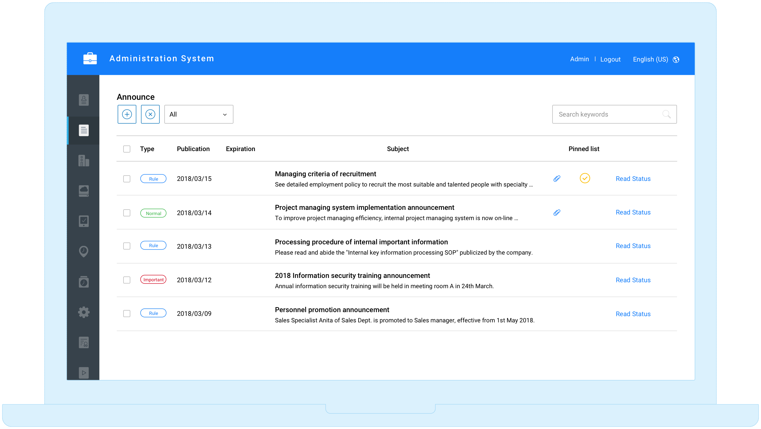 Company announcements can be categorized and scheduled for publication. The system also shows whether each user has read the announcements they are required to.