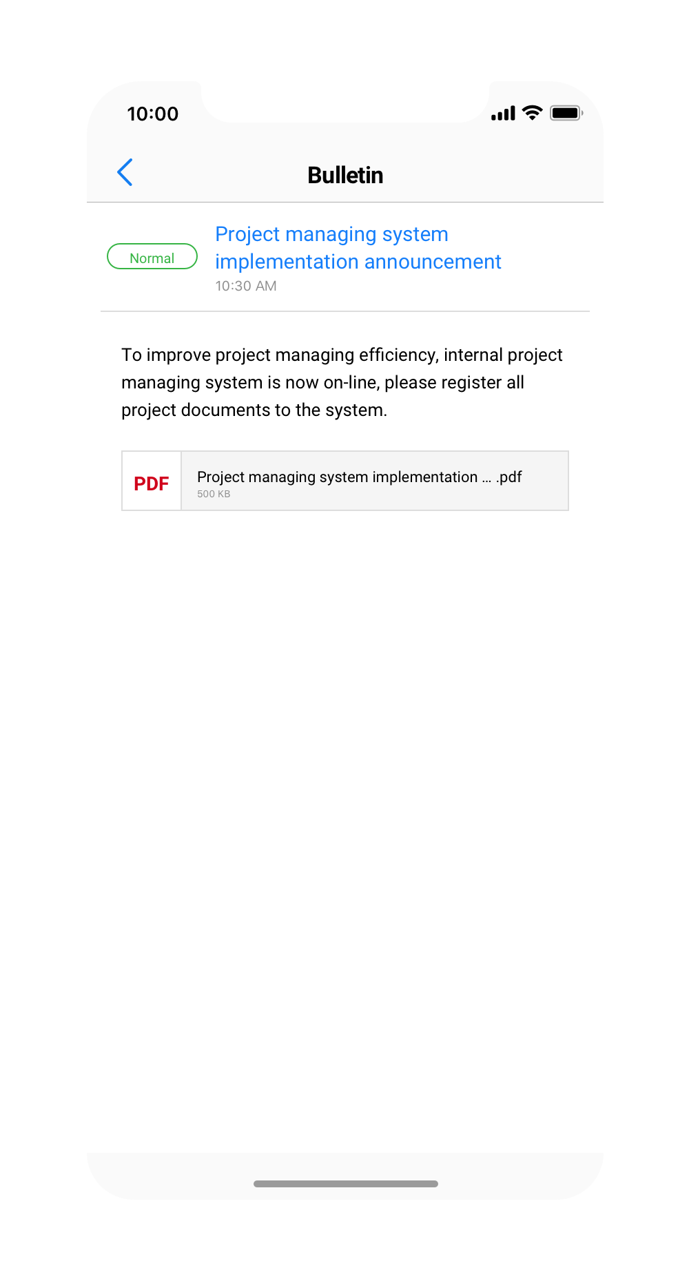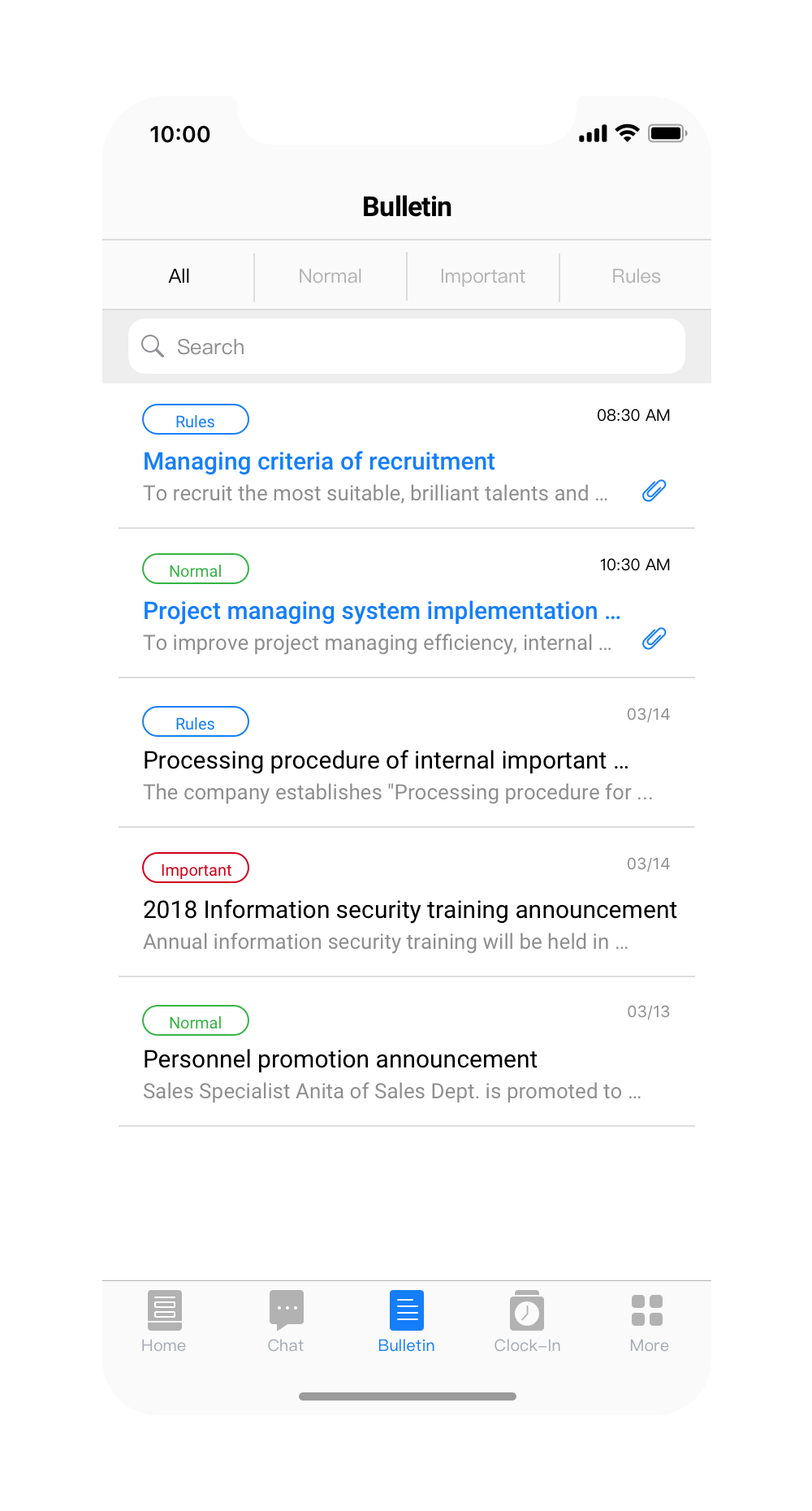 The bulletin feature enables information announcements with predesignated dates, file attachments, and the ability to view read statuses, ensuring that important work information is effectively transmitted.