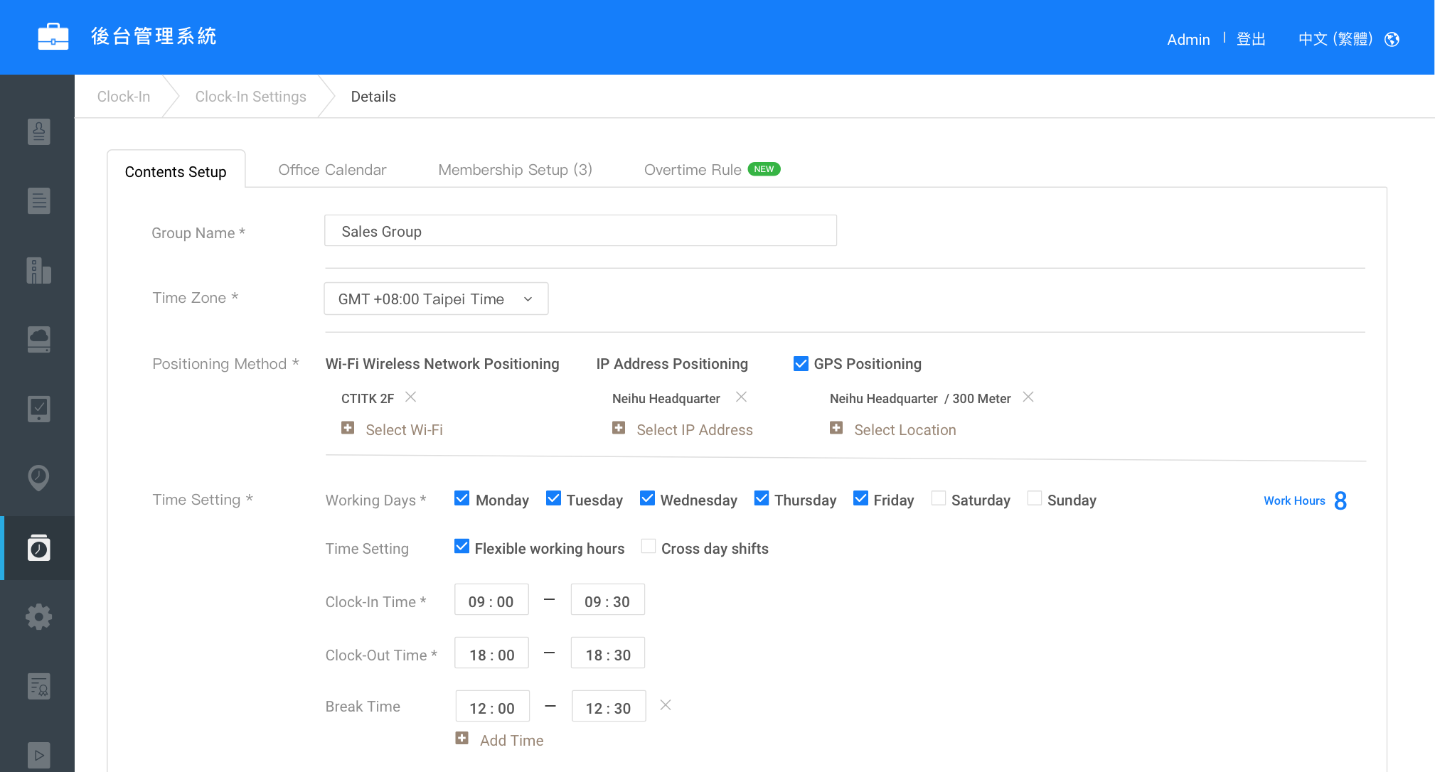 Flexible settings for working days, clock-in/out times, and break durations based on each shift, supporting adaptable working hours and cross-day shifts.
