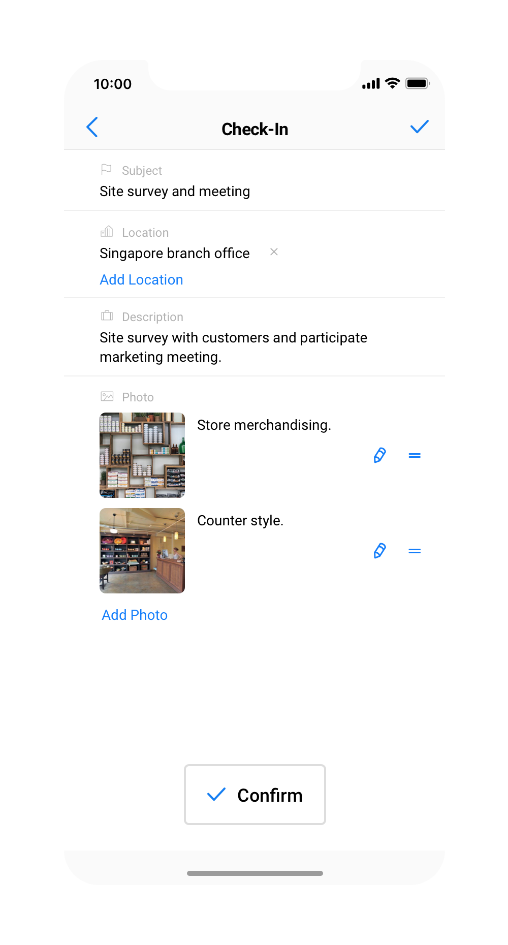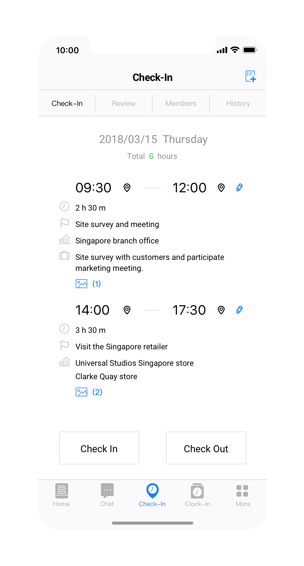 Multiple check-in records can be logged daily, capturing work details such as time, location, content, and more. Photos can also be uploaded to support field management and maintain thorough travel records.