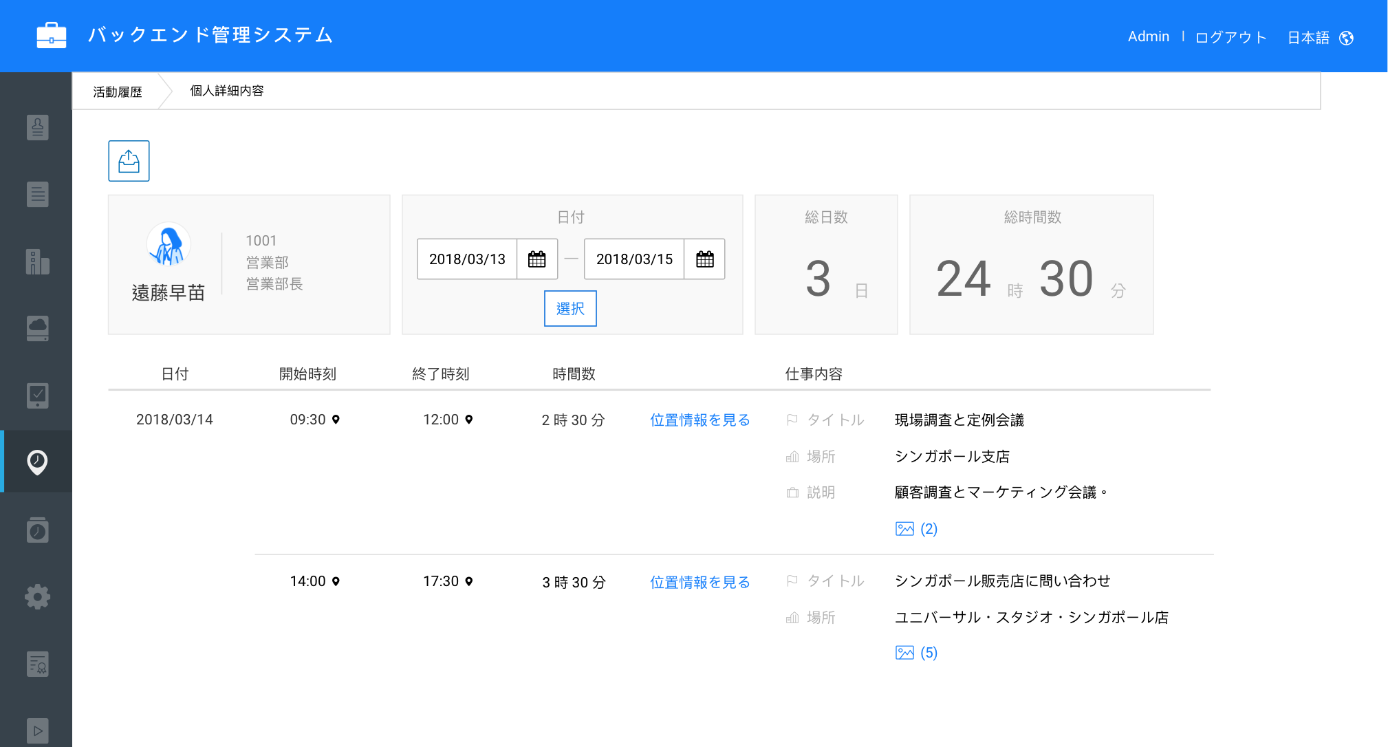 スタッフの外勤記録を完全に記録することで、管理者はリアルタイムで出勤時間・位置情報を確認できます。外勤時間は自動集計されるため、管理業務の飛躍的な効率化を実現。
