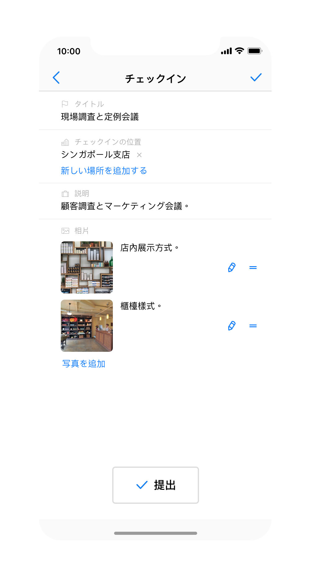 時間、場所、作業報告を含むスタッフの外勤記録を効果的に追跡し、外勤状況の適切な確認が可能です。